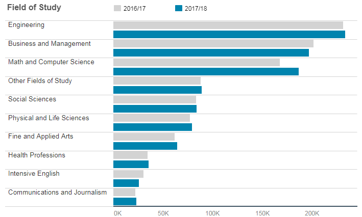 工程、商科和管理、数学和 CS专业 仍是留学生最青睐的专业,有超过一半的留学生选择此类专业。人数增加最多的是 “Math an Computer Science”。