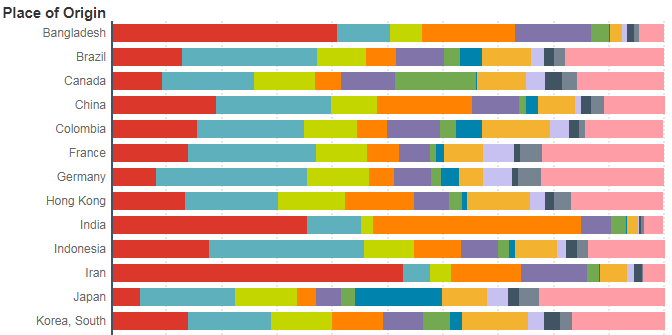 从 2006年至2018年,连续12年,美国高校接收的国际生数量呈直线上升趋势。但仔细看,尽管总数有所增加,其实增幅明显放缓,2017-2018年增幅仅为 1.5% ,大家可以 2015、2014对比。