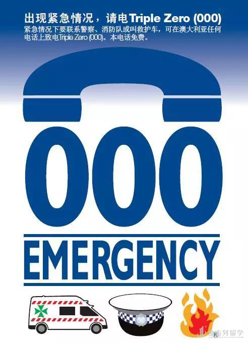 澳大利亚的紧急电话是 000,报警范围包括警务(Police)、救护(Ambulance)或者消防(Fire Brigae)等。