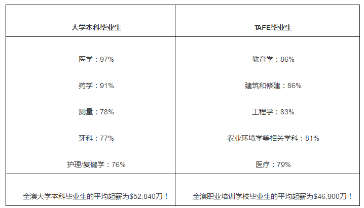 接下来洪老师分别从起薪和就业率的排名来看下大学本科生和 TAFE学生在毕业后的差别,一起来看吧!