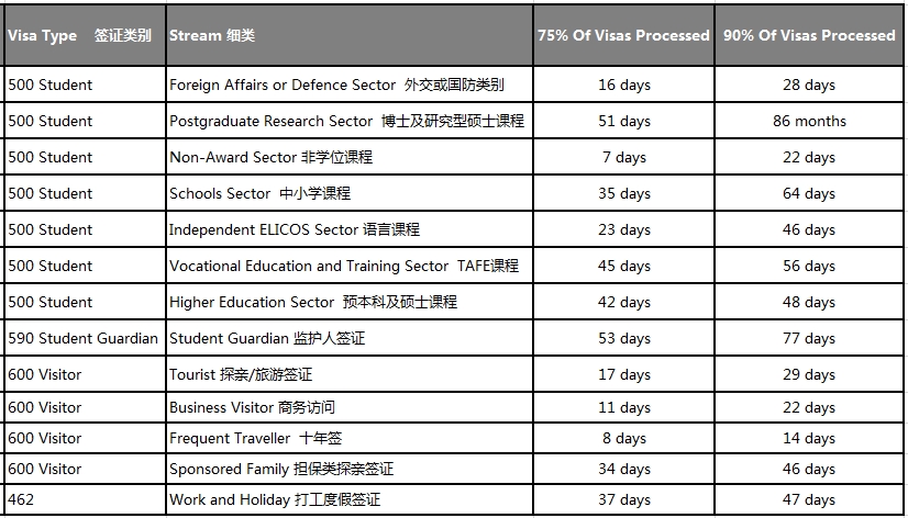 针对常见签证类别,我们汇总了澳大利亚移民局官网2018-11-21最新发布的 全球范围内签证评审时间 ,