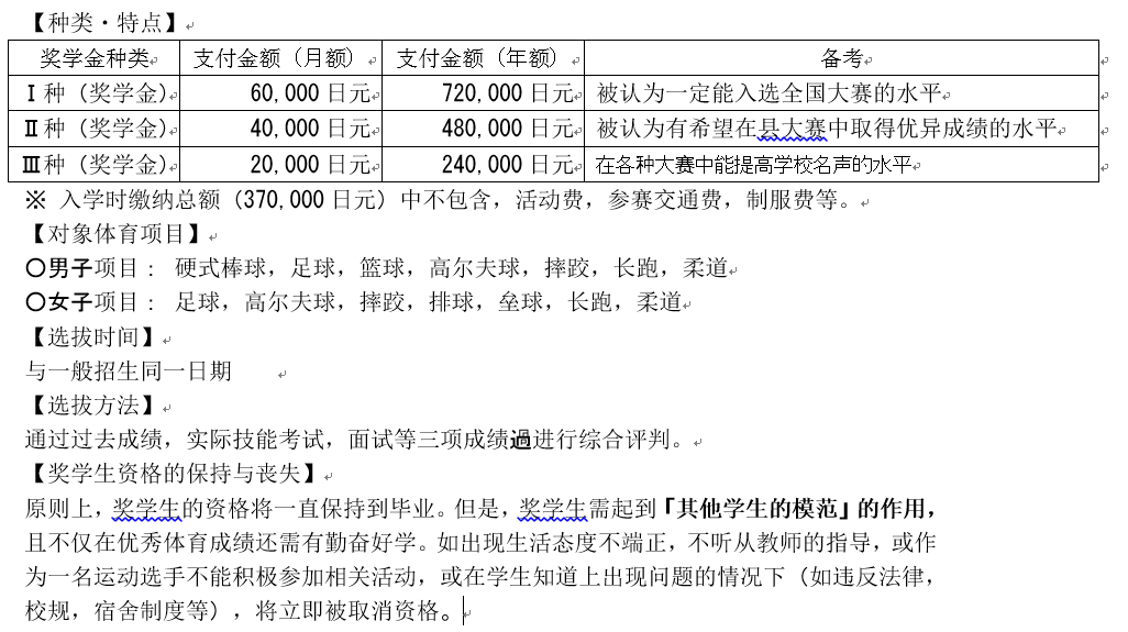 运动奖学金:在学校指定运动项目中获得卓越成绩,以在日本全国大赛中获得名次为目标的学生为考察对象。