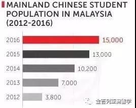 2016年,已经有15000名中国大陆留学生前往马来西亚开始他们的留学生活,较2015年上涨了15.4%。在2012年,到马来西亚深造的中国留学生仅3800位,去年的留学生上涨象征着四年来的一次大飞跃。