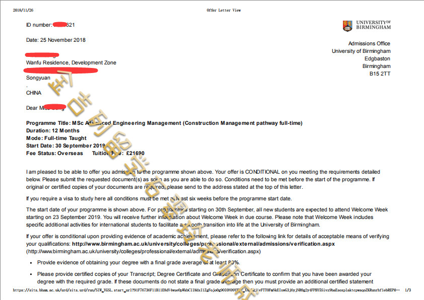 在此恭喜丛同学顺利拿到伯明翰大学录取。