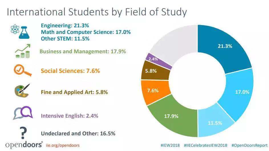 而在专业选择上,工程和商科类专业仍然是大部分留学生的首选。其中21.3%的留学生选择的是工科专业,数学,计算机等STEM专业依然大受欢迎。商科紧随其后,17.9%的留学生选择了商科类的专业。赴美留学生中选择艺术类专业的则为5.8%。