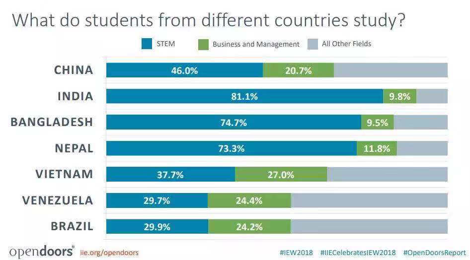 那么来自不同国家的留学生又都倾向于选择哪些专业呢?从上图可以看出,约有46%的中国学生选择了STEM专业,20.7%的赴美留学生选择了20.7%。相较于中国,印度等国的学生对于STEM专业的热衷更为明显,81.1%的印度留学生选择了STEM专业。