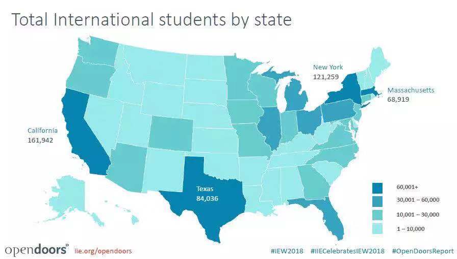 最受留学生欢迎的美国地区分别为东海岸的纽约、麻省;西海岸的加州;以及南部的德州。其次分别有伊利诺伊州、俄亥俄州、宾夕法尼亚州、密歇根州、亚利桑那等州。