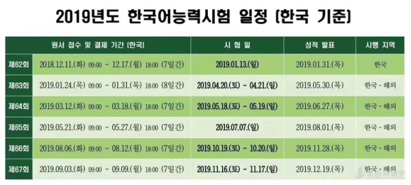 2019年TOPIK韩国语能力考试考试日程公布啦!2019年共有6次考试,中国地区有2场(4月63届、10月66届)。63届TOPIK报名时间中国地区将于12月底公布,按往年预计将于12.25-12.27开始报名。