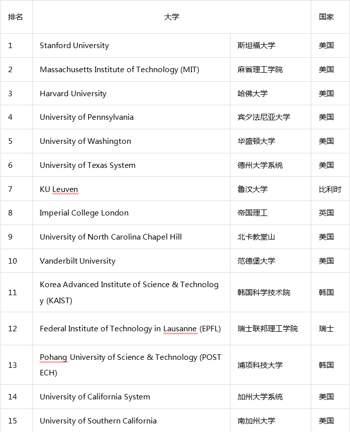 比利时鲁汶大学名列第七,是“非美”排名最高的大学。英国排名最高的是伦敦帝国理工学院,第八名;此外路透社特意指出,曼切斯特大学是本年度排名上升幅度最大的,从去年的第80名跃升至第53名,很大程度上归功于超金属石墨烯的研究;曼彻斯特大学过去五年间申请的专利中,有四分之一都与石墨烯有关。