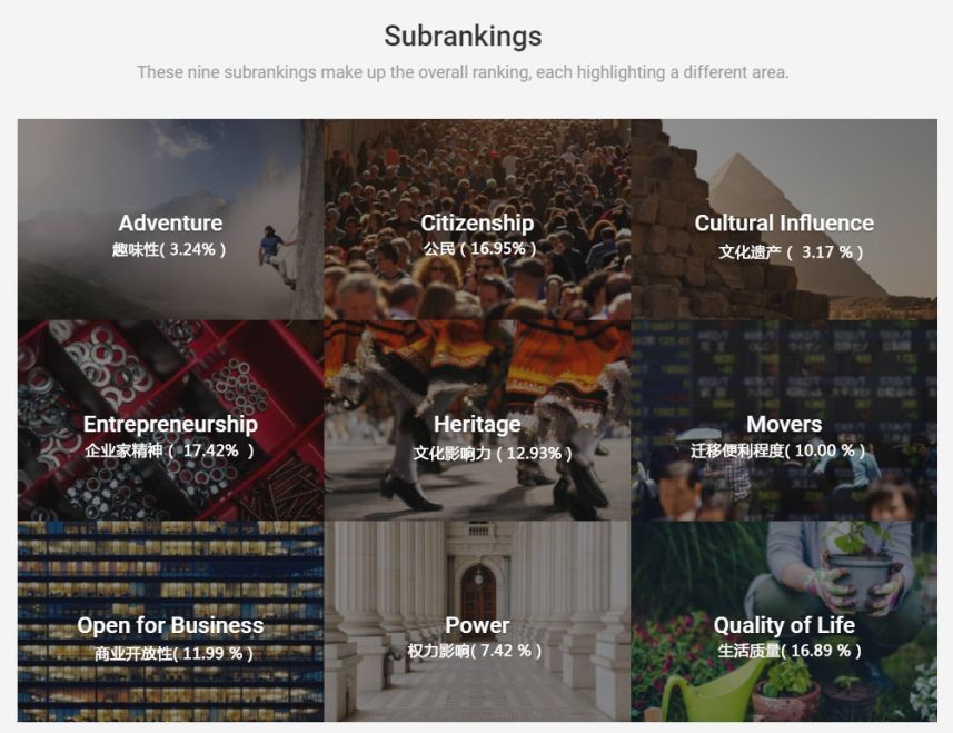 2018 年最佳国家,主要通过以下九个方面的不同权重严格打分后,进行评估国家的整体情况并产生的综合排名。
