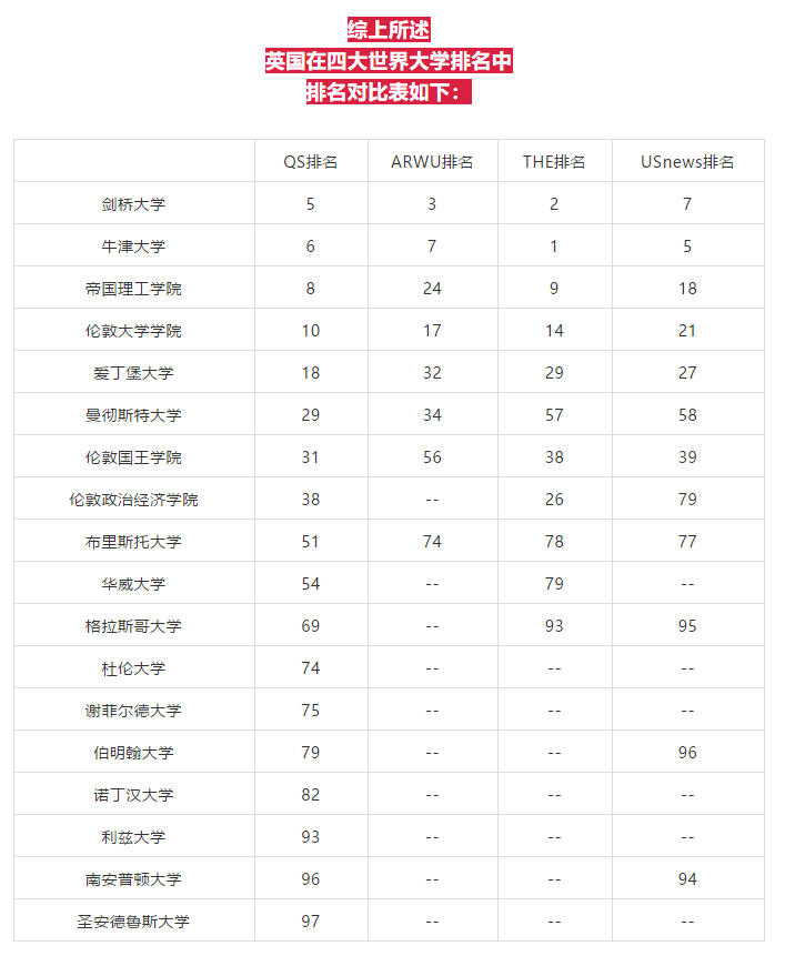 四大排名:QS世界大学排名、ARWU上海软科世界大学排名、THE泰晤士高等教育世界大学排名、U.S.News世界大学排名,已全部公布完毕,申请英国的小伙伴们,想知道四大排名中有哪些英国大学在TOP100内吗?你的ream school在四大榜单中都可以找到吗?我们一起来看看吧~~