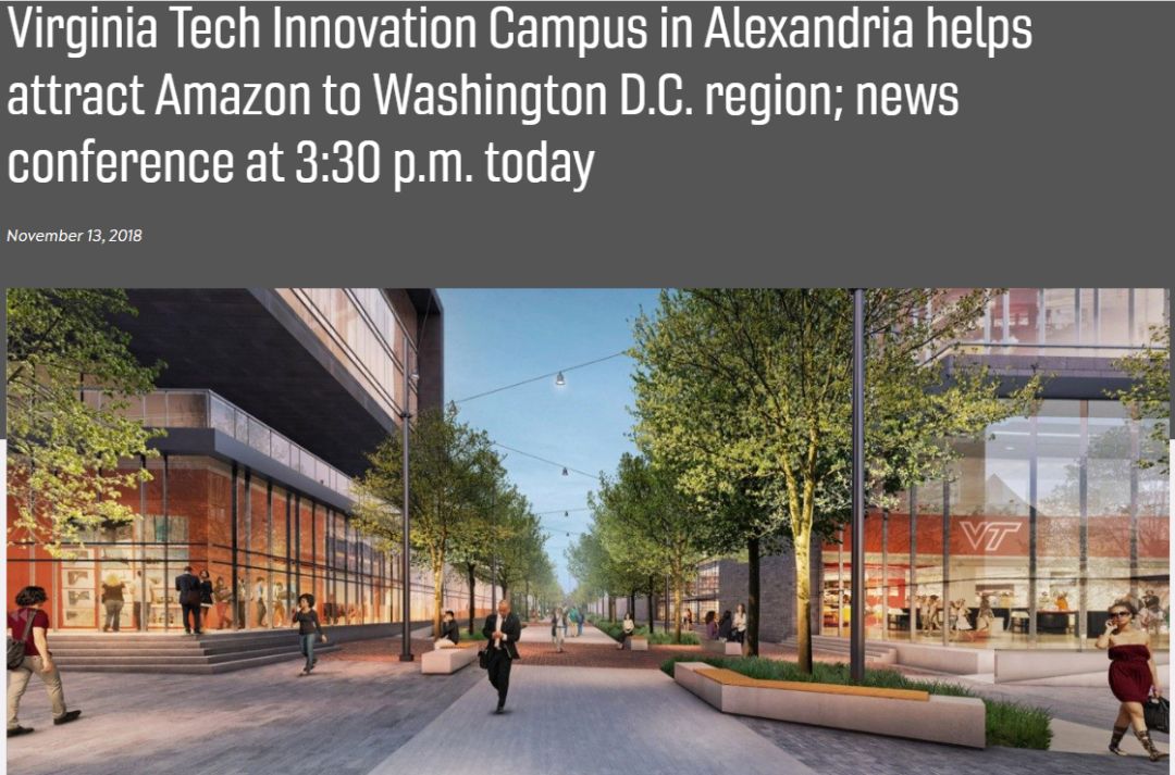 弗吉尼亚理工大学 宣布,为给亚马逊新总部提供人才支援,将在弗吉尼亚州Alexanria投资10亿美元建设创新 技术 校区,距离1号公路仅两英里。Virginia Tech表示,新校区既是全面高等教育计划的一部分,也是亚马逊最终选择弗吉尼亚作为新总部的关键原因。