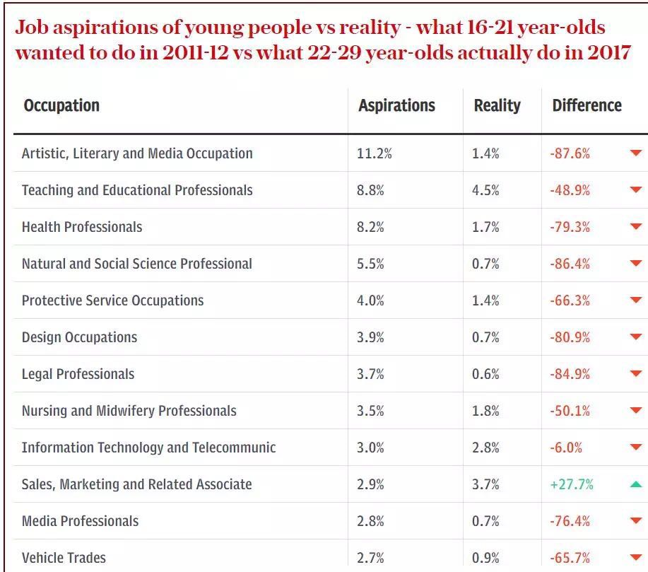 小时候,我们想成为明星、想成为宇航员、想成为科学家,可有时候却发现理想与现实相距甚远…最近ONS(英国国家统计局)的一份分析数据,对比了当初16-21岁的年轻人的梦想和今天22-29岁的他们实际在做什么,发现结果大出所料…