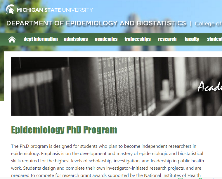这个博士项目是为那些打算成为流行病学独立研究人员的学生设计的。 重点是发展和掌握流行病学和生物统计学技能,这是在公共卫生工作中获得最高水平的学术、调查和领导能力所必需的。 学生设计并完成他们自己的研究者发起的研究项目,并准备参加由美国国立卫生研究院(National Institutes of Health)和资助流行病学研究的其他机构资助的研究拨款竞赛。