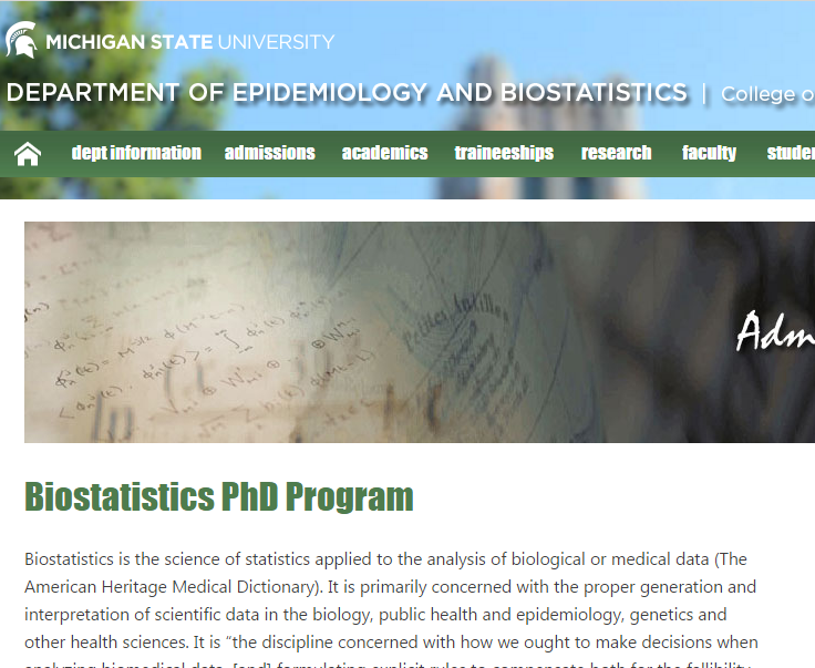 •2-8年,在生物统计学、统计学或同等学科获得硕士学位后,学生有8年时间完成所有要求并完成博士论文答辩。