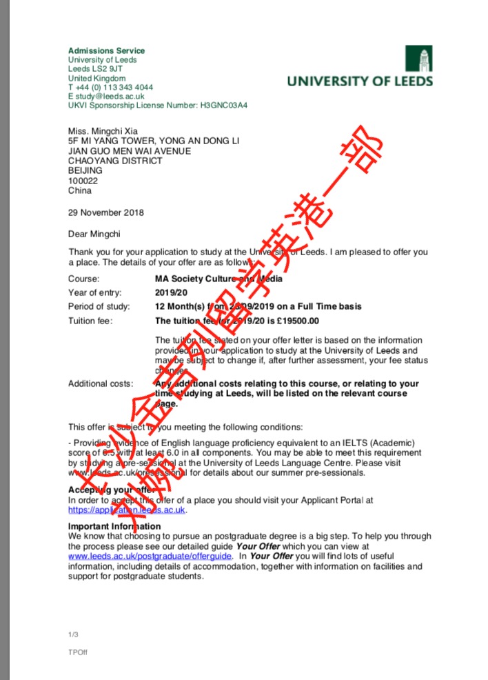 学生的均分较低,但是有比较丰富的工作经历,所有的工作经历都有体现在文书里面,文书将学生塑造的比较好,与此同时,由于学生涉及的工作范围很广,所以我们也补充了一封CV给学校。值得注意的一点是,利兹的这个专业,其实是偏研究性的,学校的老师也多次跟我们指出,这个专业不怎么会考虑本科背景是编导、播音主持专业的学生,也是考虑到这一个因素,所以文书里面我们主要还是针对于学生毕业后的工作能力以及背景,最终成功拿到录取。