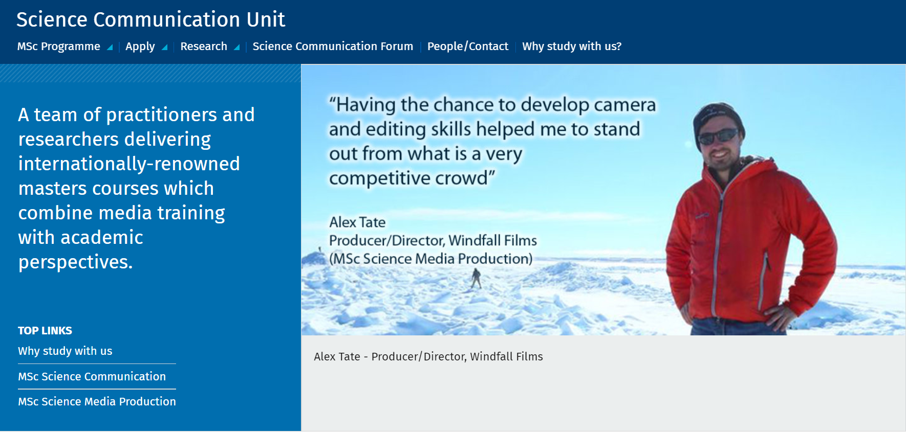 帝国理工下设Science Communication Unit(科学传播单元),虽然该单元只开设了2个硕士专业,但都与传媒息息相关,并且非常有特色。