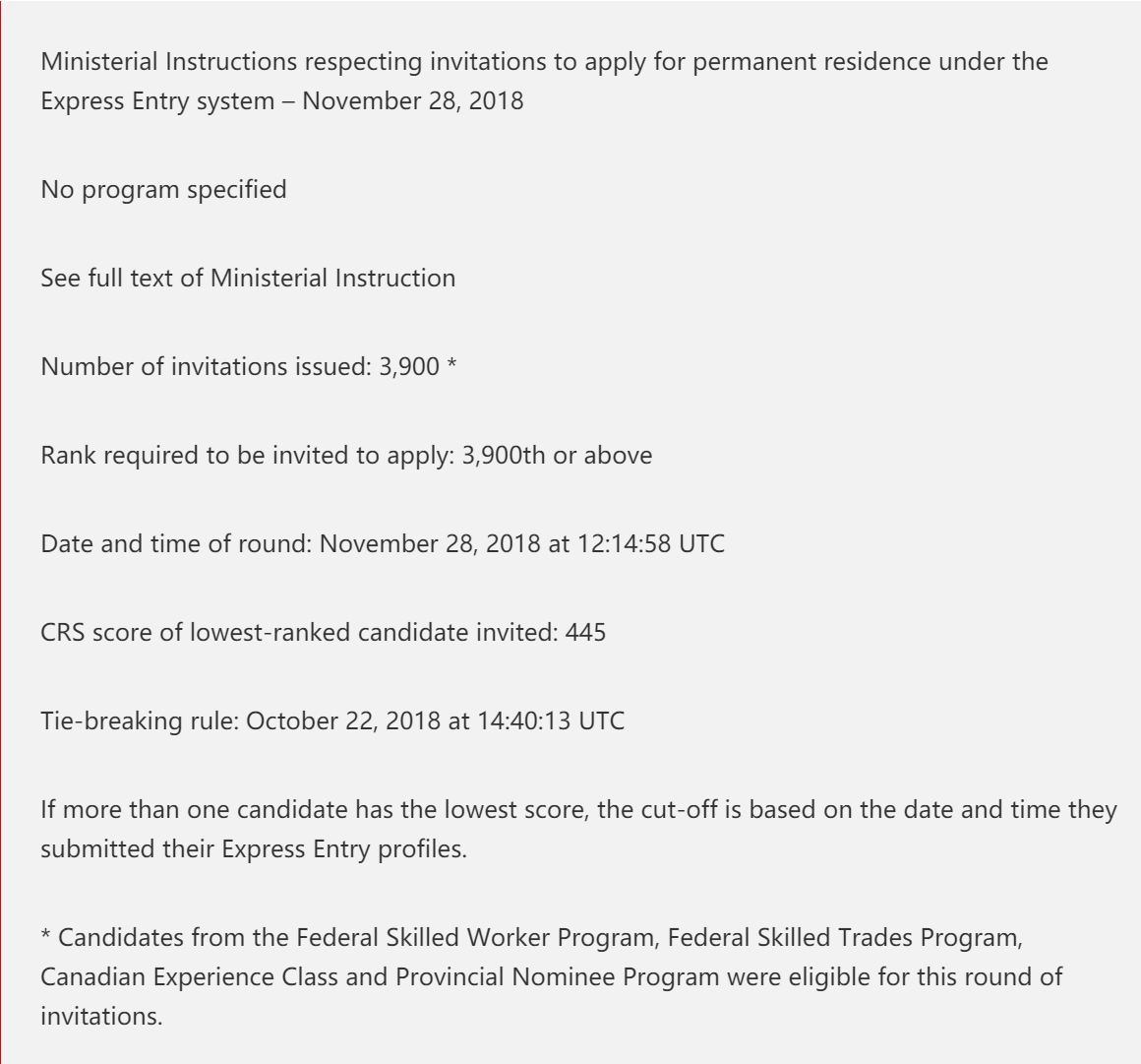 11月28日移民快速通道Express Entry第105次邀请分数线445,邀请3900人,不分职业、不分类别。