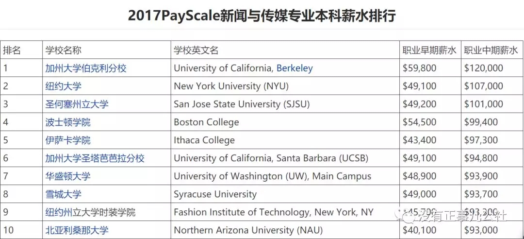 完成美国传媒专业的学习后,你的工作机会和薪水也将非常可观,以下是2017PayScale新闻与传媒专业本科毕业生的薪水排行:
