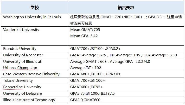 就语言上来说,这 10所学校都接受GMAT和IBT的成绩。并且基本上对平均分都做了一定的统计,但是要注意真正录取的分数往往比这个高很多, 比如 university of Rochester GMAT平均分是675分,但是去年37%的录取者的GMAT为710分以上。