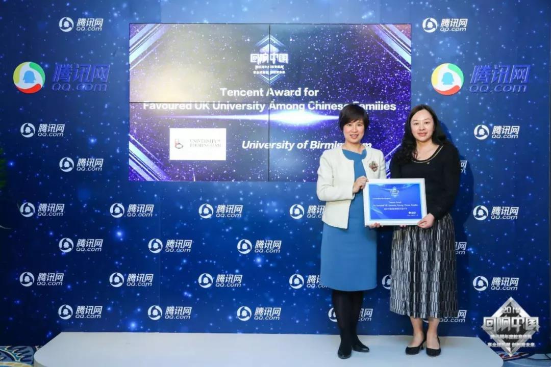 近期伯明翰大学获得了腾讯 2018 年最受中国家庭欢迎的英国大学,伯明翰大学中国办公室的两名老师 Vivien Zhang 和 Mingya Zong 在北京的活动中接受了此奖项 在接受腾讯媒体采访的时候, Mingya Zong 老师说:“这个奖项是对我们大学最大的认可和肯定,非常荣幸收到此次奖项,很感谢中国的家长和同学”。