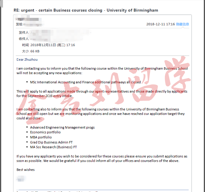 伯明翰大学刚刚发来消息通知 , MSc International Accounting an Finance aitional pathways 课程已经关闭申请,学校将不再接受新的申请。 以下伯明翰大学商学院课程的申请依然开放,但学校在严控,一旦申请人数达到学校的预期,学校将关闭以下课程。望各位老师告知学生。附件里面是伯明翰大学发来的邮件。