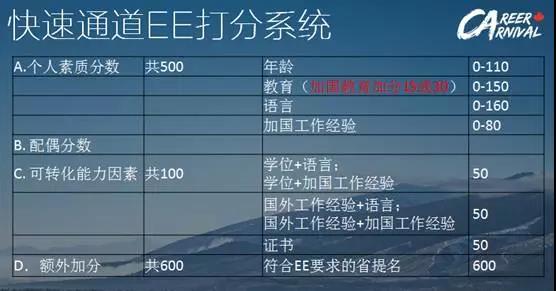 EE从2015年1月开始实施,实施的目的是通过技能,工作经验,语言能力,教育水平等综合打分来筛选最适合加拿大需要的人。评分标准如下: