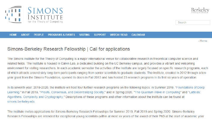 华尔街对冲基金经理、数学家James Simons捐款给母校加州伯克利大学成立西蒙斯计算理论研究所,启动资金高达六千万美金。在研究所中,“世界顶级的计算机理论专家和研究人员将探索计算科学的数学基础,并利用研究成果解决科学领域中的挑战性问题。”现为国际生博士/博士后提供30个奖学金,4个研究主题。