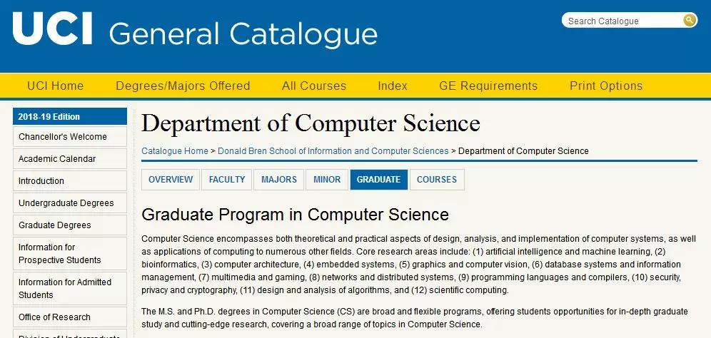 UCI计算机科学只开放秋季招生,开设有MS/Ph.D in Computer Science(有论文), Master of Computer Science (没奖学金),UCI属于录取中国学生较多的院校之一,CS更是如此,最低要求GPA3.0,托福80,雅思7.0,但GRE320+ ,TOEFL100+的可能性比较大,最好有相关专业背景。