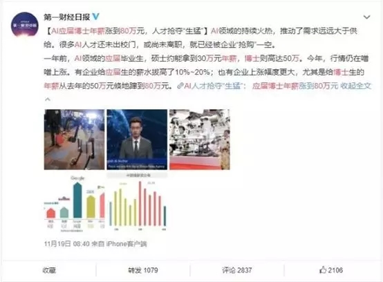 相信大家被前些天人工智能(AI)应届博士毕业生80万的新闻刷屏了, 有人说现在转专业来得及吗?也有人说 “ 站在风口上,谁都能飞起来 ” 。 一切都是源自下面这条微博: