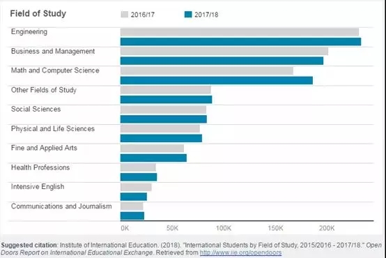 关于美国留学情况的《 2018 年开放门户报告》中显示(如下图), 2017-2018 年,在美国学习数学及计算机科学领域(包括人工智能)的国际学生人数为 186,003 人,相比前一年增长了 11.3% ,占国际学生总人数的 17% 。这表明国际学生对于去美国学习计算机相关领域也是极其认可的。