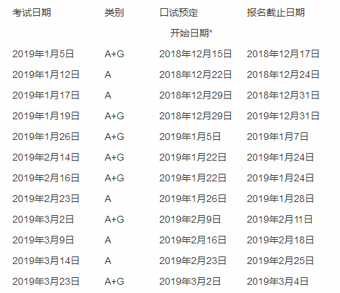 2019 年雅思考试时间