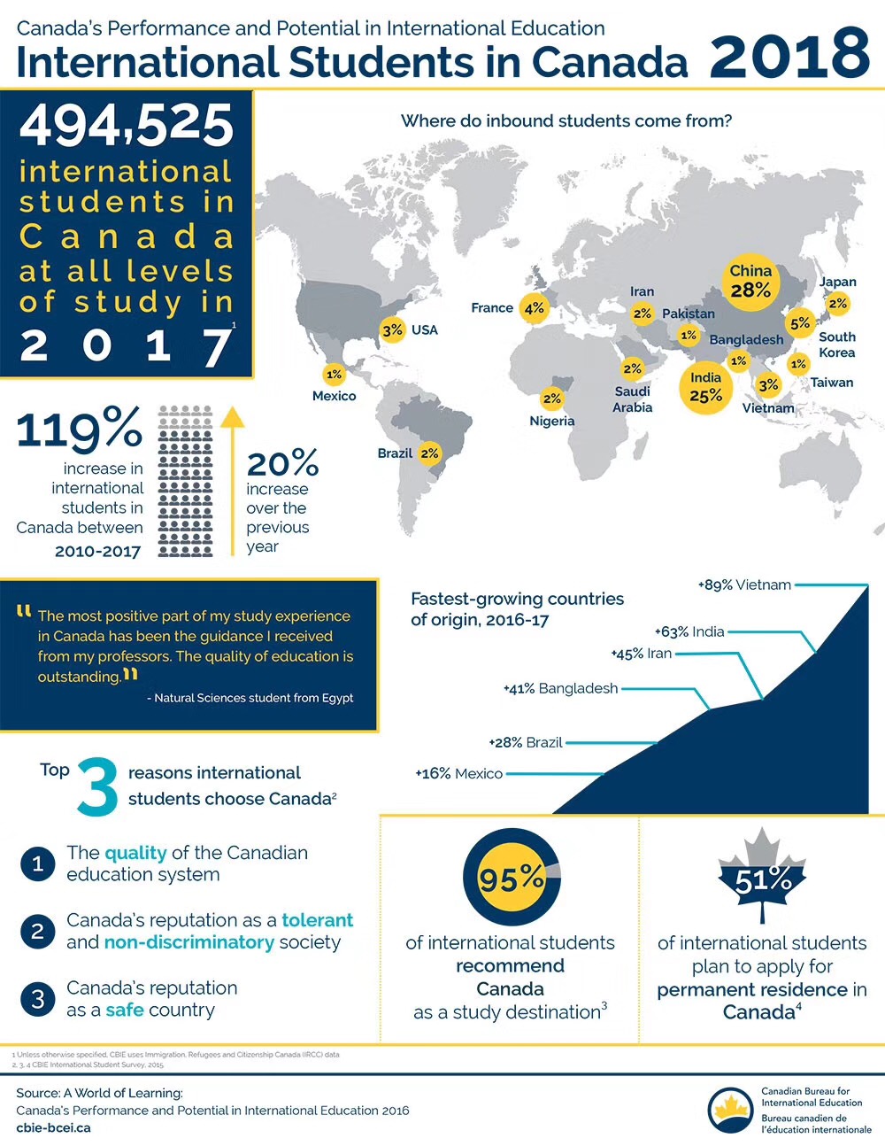 数据显示,加拿大 2017 年接纳近 50 万国际学生,其中中国学生占 28% ,印度其次,占 25% 。同 2010 年相比,国际学生数量增长 119% 。超过一半的国际学生,计划申请永居。
