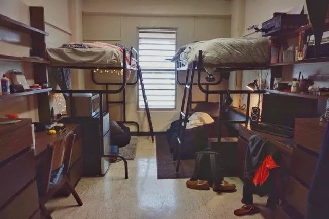 学校分配给大一新生的有 四栋 在Hecht & Stanfor住宿区,有 单人间 和 双人间 两种类型的宿舍,可以自己 单付钱 对房间 进行改造 (如下图可把床升高)。其中在Hecht & Stanfor里, 每层只有一个公共淋浴间和卫生间 ,设有单独的隔间,而且 洗衣服和干洗都不收费 。而有些新生则有可能被Eaton宿舍区,与高年级学生一起。 大二 的话,学校 不会强制住校 ,可以自己出去租房,也可以申请学校里另外三个住宿区的宿舍。