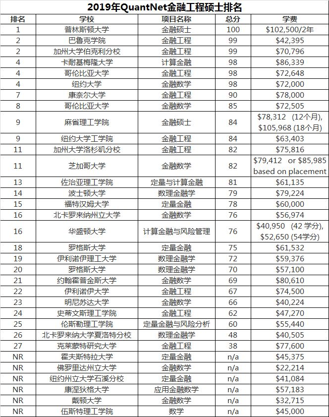 想申请金融工程的同学,QuantNet的金融工程排名一直是很多学生申请院校的重要参考,就在2018年12月5日,QuantNet发布了2019年最新北美金融工程硕士项目排名。