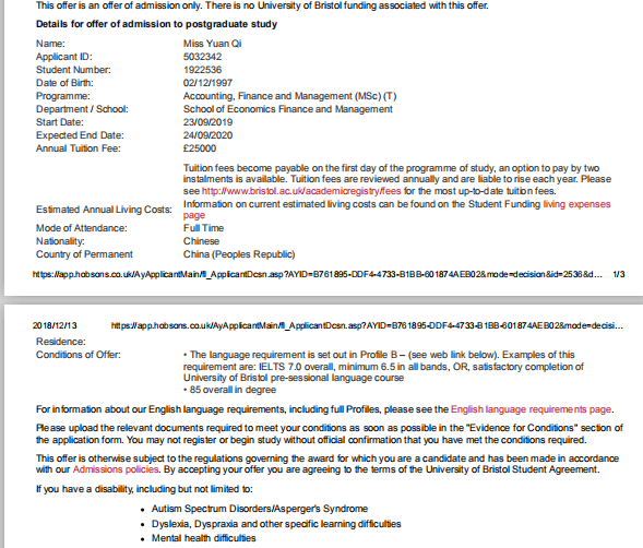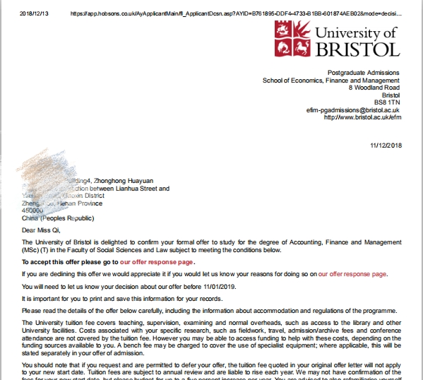 恭喜祁同学,在12月中旬成功拿到布里斯托大学商学院会计,金融和管理专业录取。学生本身国内211 会计专业(ACCA)方向,ACCA已经过了9门,均分:89分 雅思:7分 GMAT:720分。等待更好学校的录取通知书!!!!!
