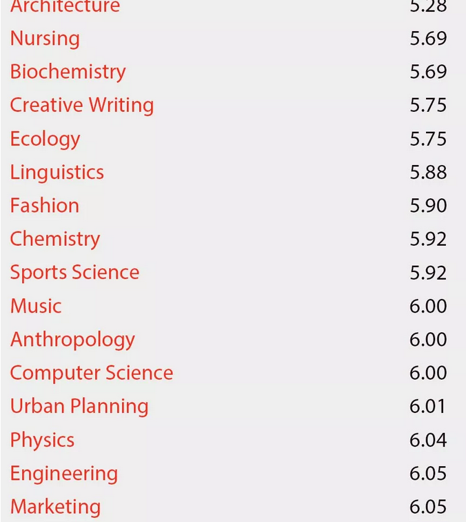 在“最缺觉”的专业排名中, 建筑学 荣登第一,平均每晚只睡5.28小时,他们不仅是最勤奋的,也是最沉睡的(近80%的建筑系学生在课堂上沉睡一次及以上)。而 艺术史、公共关系、 微生物学 专业的同学竟然睡眠时间超过7小时?!Amazing!