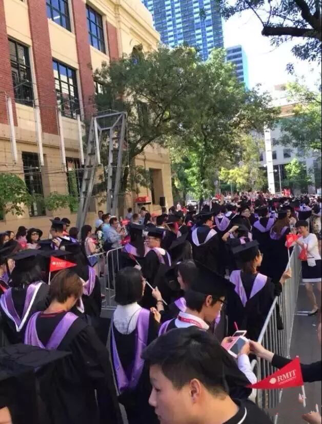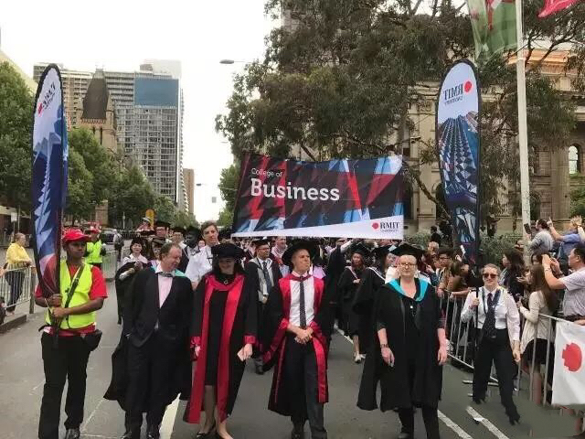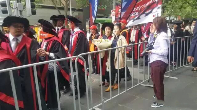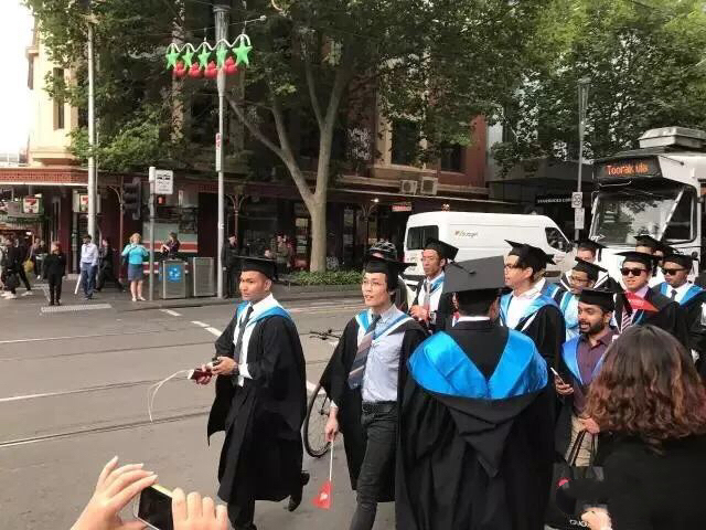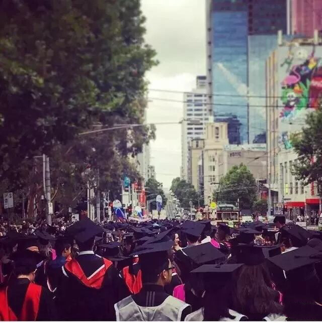 毕业典礼当天,整个墨尔本市区被RMIT的俊男靓女们给占领了!他们身穿学士袍,各个笑面如花!