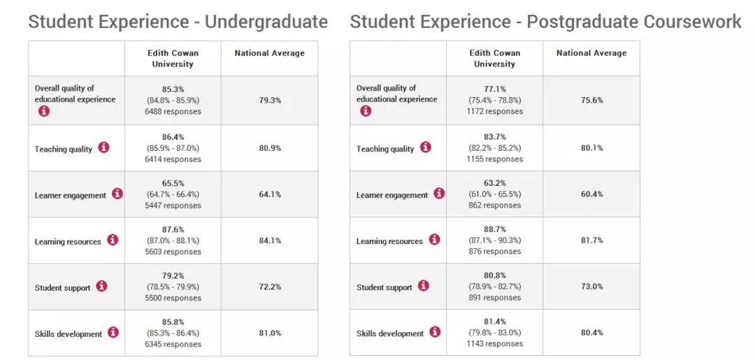 该项结果主要源于SES学生体验调查Stuent Experience Survey统计分析,包含:院校体验、教学质量、学生参与、学习资源、学生支持、技能发展。此次2017年的最新调查,全澳一共有20.6万名学生参与,其结果极具权威。如下为ECU本科和授课型研究生对大学的满意度调查结果,各项指标均远高于澳洲各大学平均水平。