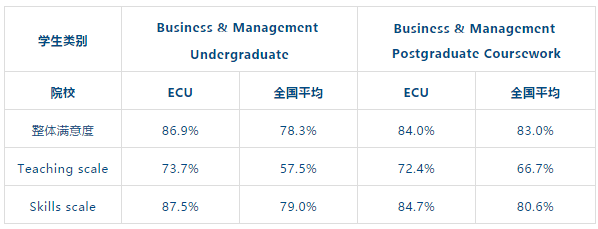 ECU工程专业毕业生在通用技能获得方面硕士生满意度高达83.9%,远高于全国平均81.1%水平;教育学本科生的整体满意度高达87%,远高于全国77.8%的平均水平;其实很多专业ECU的毕业生满意度都居高不下,以中国学生选择较多的商管专业为例,如下图所示其在各项指标中均高于全国平均水平1到6个百分点。