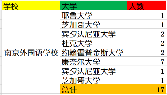 南外的国际部,IB班和中美班也不甘示弱, 收获芝加哥,宾大,康奈尔,使得南外在今年共收入17枚offer。,见下表: