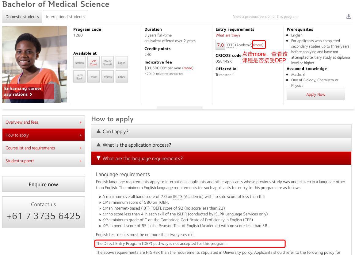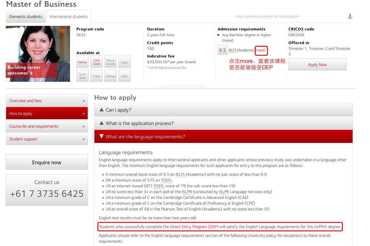 ️格里菲斯大学的语言直升班(DEP)可以对接很多专业课程,特别提醒大家在课程信息里可以查询该专业课程是否接受DEP。点击上方区域语言要求More,直接跳转到课程语言要求说明。如该专业能够接受DEP,会有相关说明:Stuents who successfully complete the Direct Entry Program (DEP) will satisfy the English Language requirements for this Griffith egree.