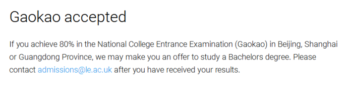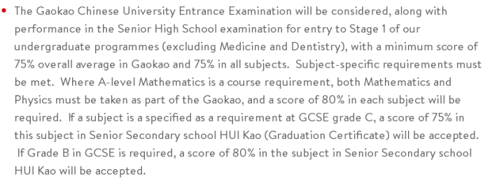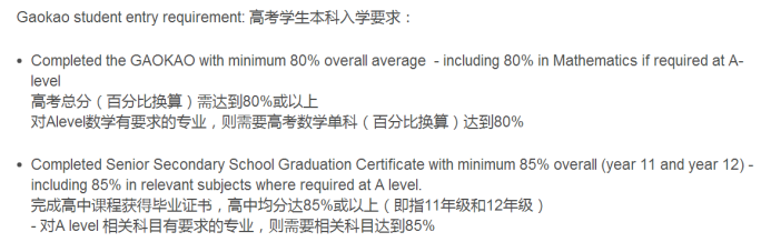 伯明翰大学在2018年10月15日宣布承认中国高考成绩。并且,这也是英国高校联盟罗素集团里第一个承认中国高考成绩的学校。但是,伯明翰大学虽然表示接受中国学生的高考成绩,但在申请要求上还是比较严格的。入学要求截自伯明翰大学官网: