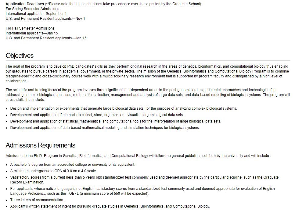 加入遗传,生物信息和计算生物学博士课程将要遵循以下基本条件: