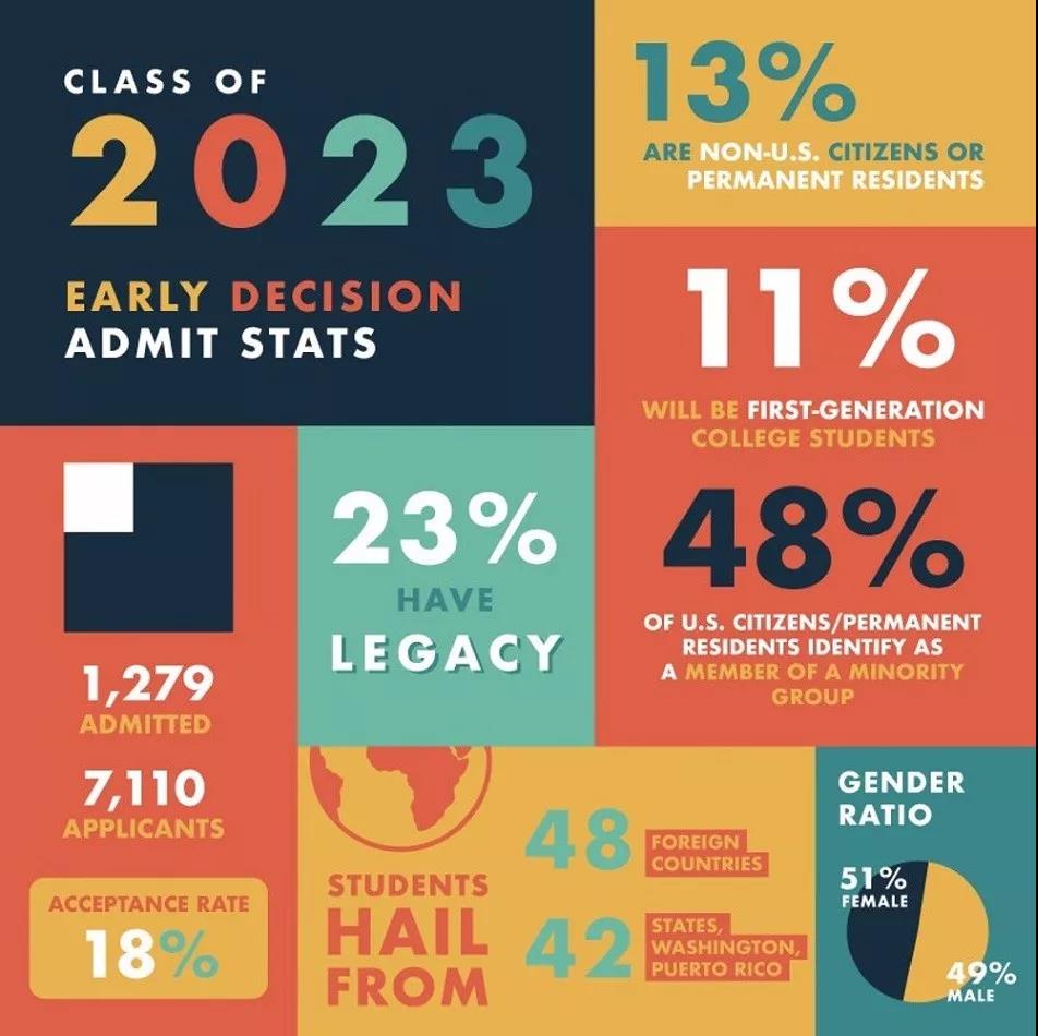 被录取者来自67个国家与49个美国州,国际生比例由去年的 8.2% 上升至 11.2%,而亚裔比例为 26.1%,相比去年的 24.2% 和前年的 21.7% 有所提升。