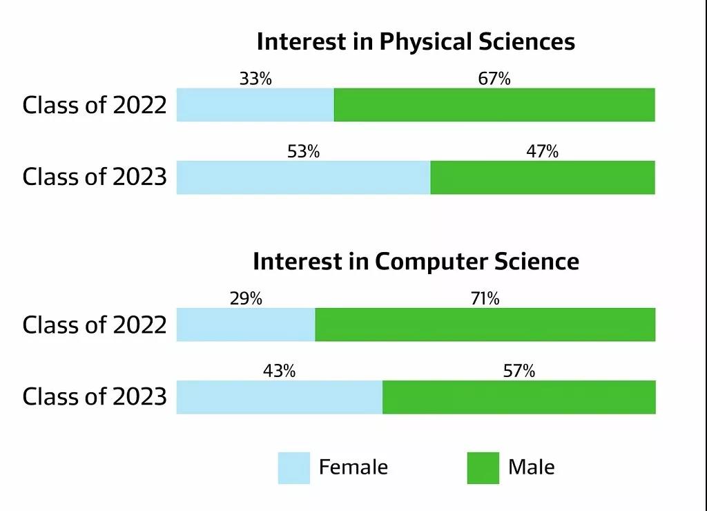 被录取者中女性占 51.3%,相比于去年的 47.2% 显著增加。而在这高比例的女性中,有更多人有意向选择计算机科学或物理科学,对计算机科学感兴趣的女性从去年的 29% 提升至 43%,对物理科学感兴趣的女性从去年的 33% 提升至 53%。整体上看,对计算机科学感兴趣的学生占录取总人数的 6.7%,对物理科学感兴趣的占 7.3%。