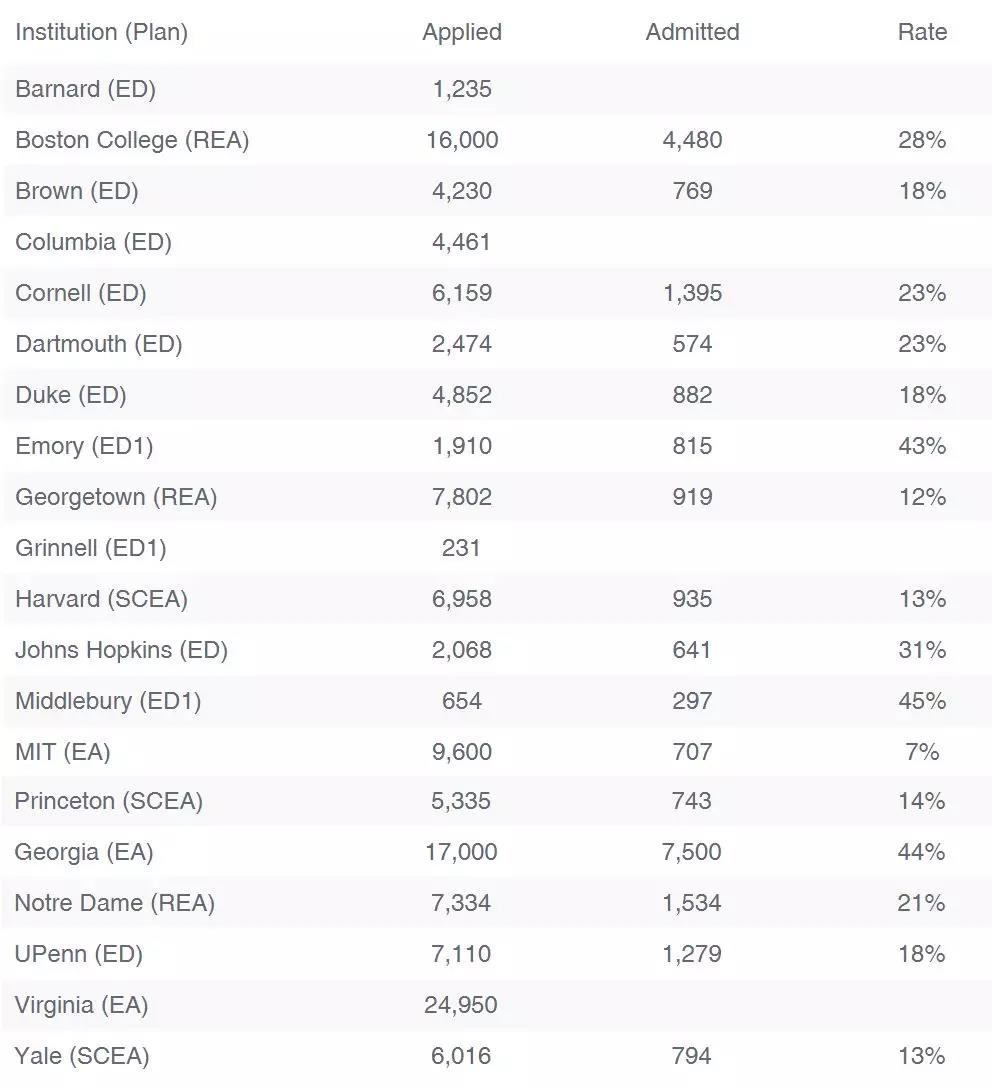 目前,在8所常春藤大学中,仅哥伦比亚大学的数据尚未完全明确,但已知其今年共收到 4,461 份ED申请,比去年增加了 9%,录取人数尚未公布。