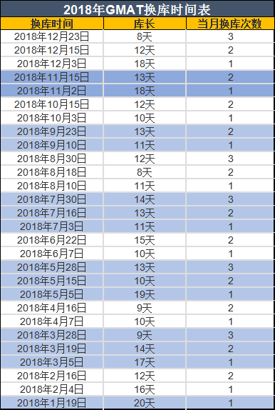 从2018换库时间也可看出,库长越来越短是事实,所以2019年备考的同学们也要做好心理准备!但值得一提的是,GMAT题库还是有很大的作用,如果刚好遇上换库来不及看题库,可能会导致分数有一定程度上的落差。