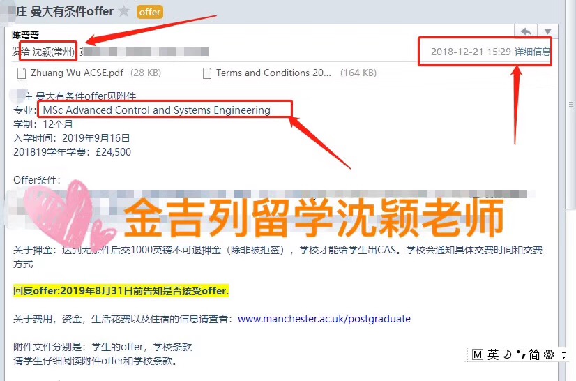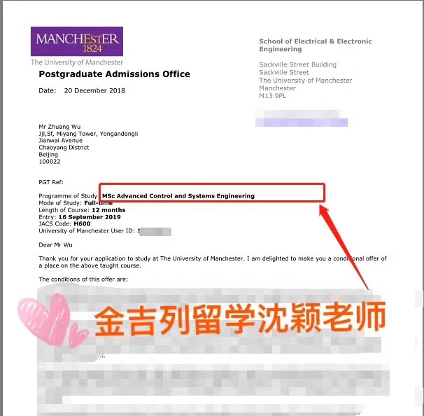 恭喜吴同学 曼彻斯特大学来offer啦 录取专业:MSc Avance Control an Systems Engineering