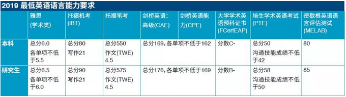 I. 雅思 6.5 ,单项不低于 6 II. 或托福 90 ,写作不低于 21 (有些专业有更高分数要求,请按各专业具体要求为准。)